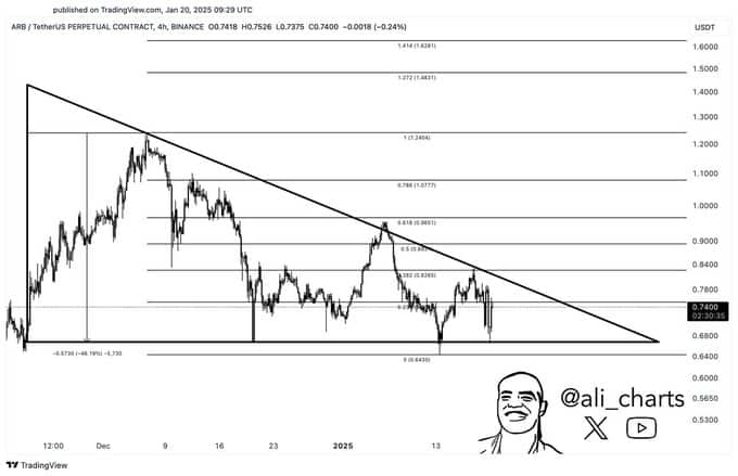 • Analysts predicted a 46% surge for Arbitrum if it breaks the $0.78 resistance within the descending triangle.