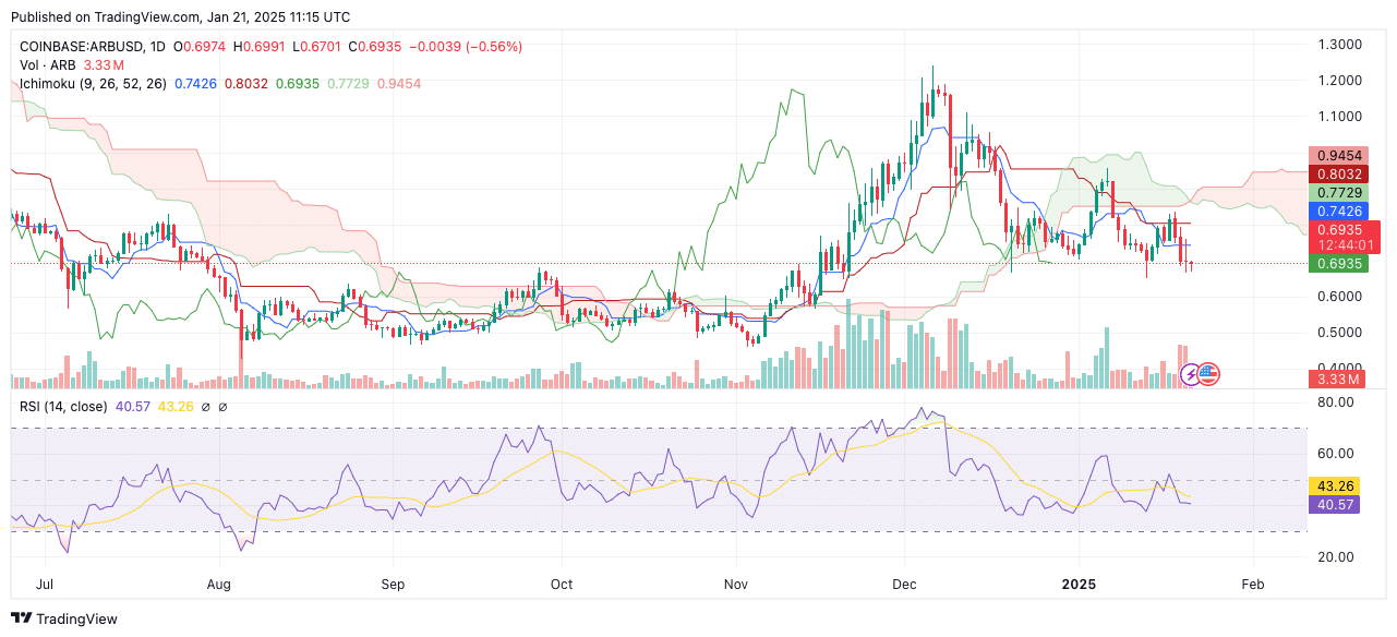 Technical indicators align with a bearish outlook in the short term. ARB’s Ichimoku Cloud analysis shows the price trading below the cloud, suggesting prevailing bearish momentum.