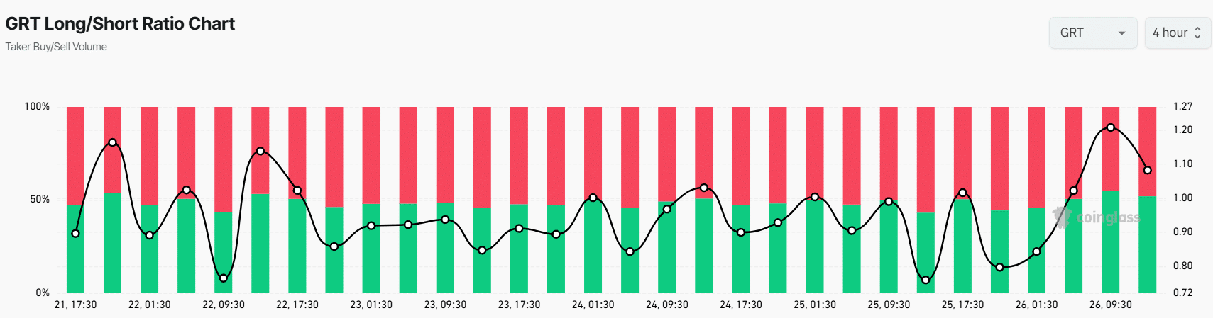 At press time, the GRT Long/Short Ratio was 1.20, indicating that for every 1.20 long position, there was one short position, reflecting a strong bullish sentiment among traders.