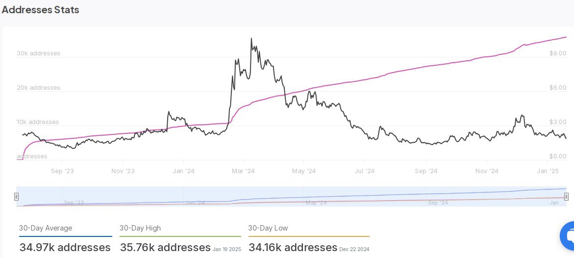 Active addresses showed a 30-day average of 34.97k, with a 30-day low of 34.16k on the 22nd of December, followed by a 30-day high of 35.76k on the 19th of January.
