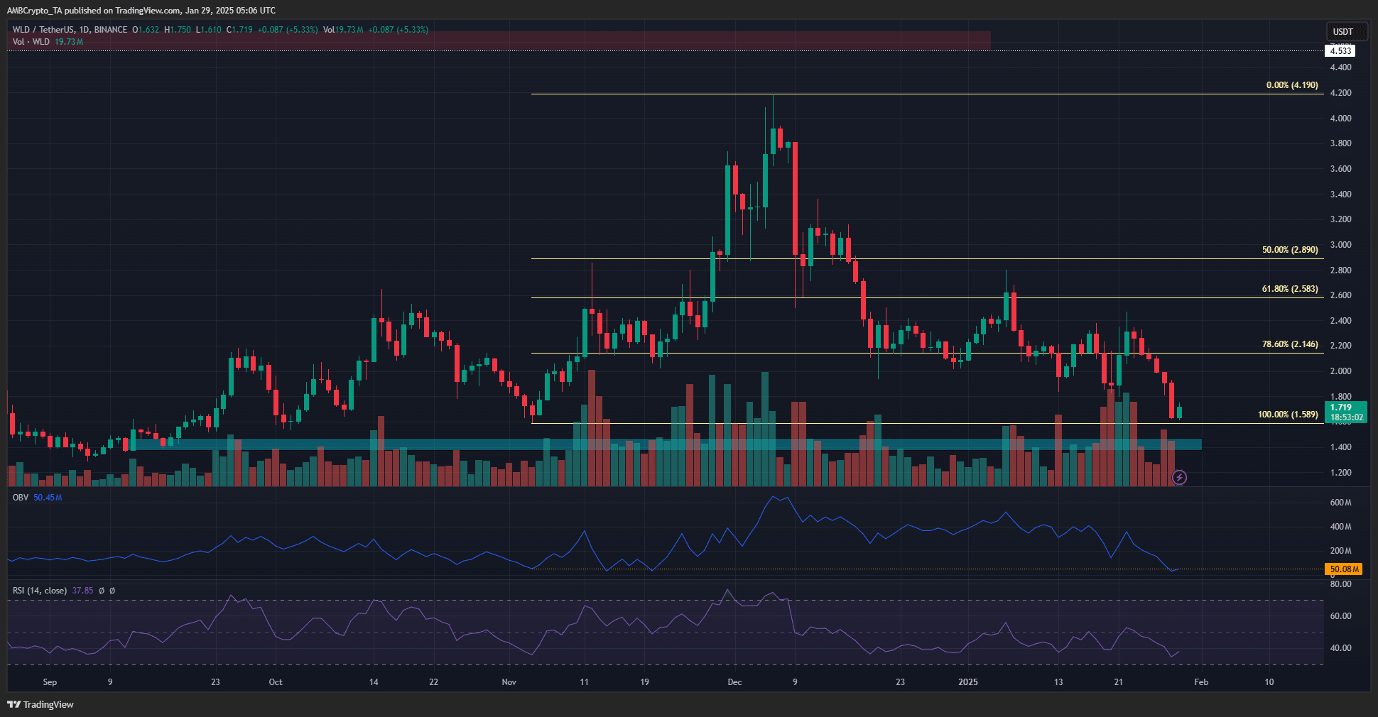 WLD saw volatility around this support level, but the selling pressure has been persistent. The OBV has steadily trended downward in January, and at press time was near the lows from November.
