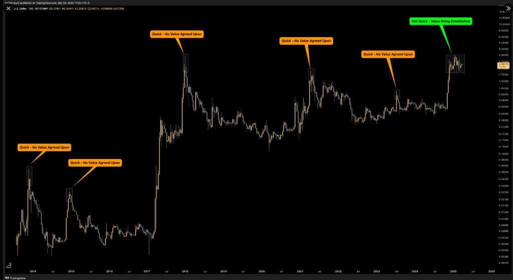 Every time $XRP has historically put in a multi month or year top, it did it quickly (as shown below)