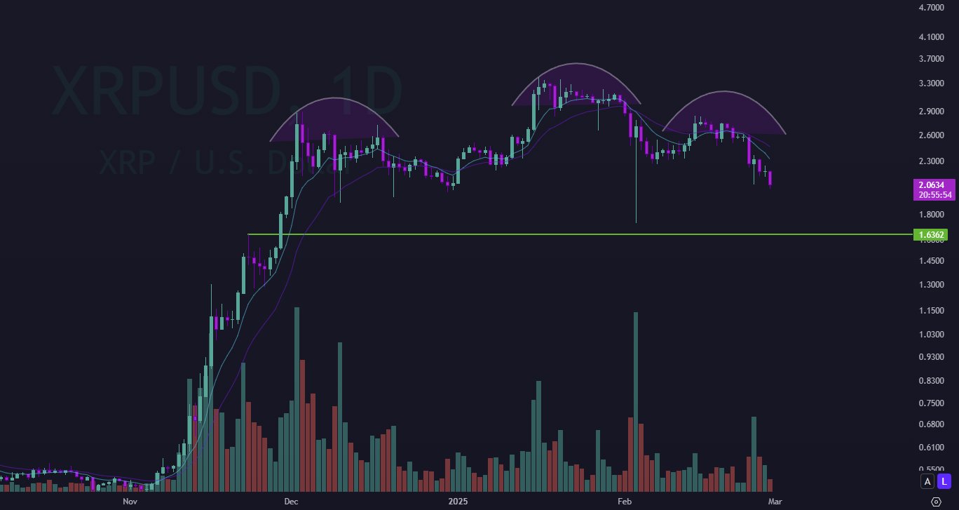 The daily chart of Ripple shows a potential head and shoulders pattern, indicating a bearish reversal. The neckline is around $2.00, a pivotal level for XRP’s short-term price trajectory.