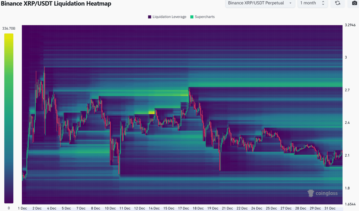 Despite the efforts of XRP bulls to defend the $2 zone, the liquidity build-up beneath this support area remains relatively small. The liquidation heatmap highlights the $1.98 and $2.23 regions in bright green, indicating these are the next significant price targets.