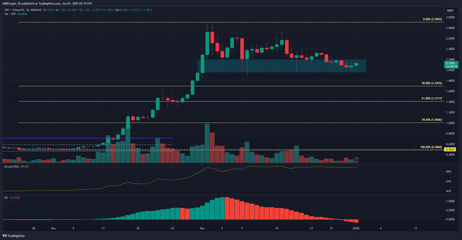 AMBCrypto’s analysis of the XRP’s daily timeframe indicates a bearish bias. The price action shows a bearish structure, and a retracement phase is underway. The Awesome Oscillator has crossed below the zero line, suggesting that downward momentum is gaining strength.