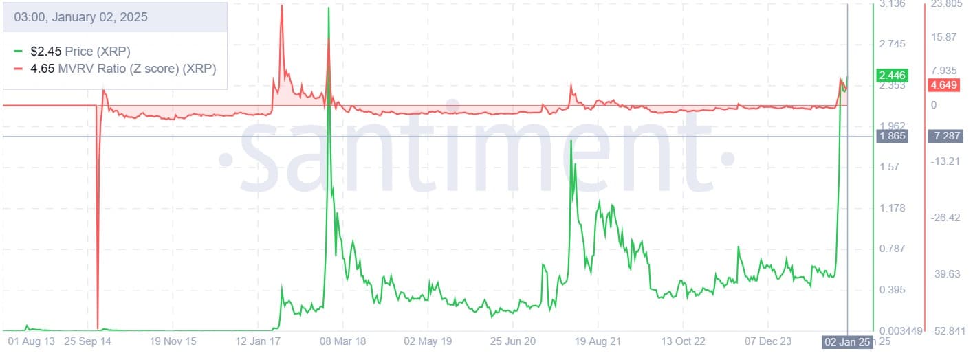 Historically, the altcoin’s MVRV has signaled the end of an uptrend when it reaches 6.5. For example, when XRP rallied to $2.8, its MVRV was 6.50. Also, the altcoin’s MVRV hit 15 when XRP’s price was $3.11 in 2018.