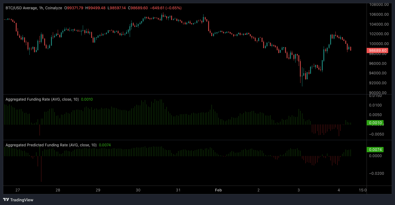 Aggregated Funding Rates indicate slightly bullish sentiment, with a predicted funding rate of 0.0074 suggesting potential short-term upside.
