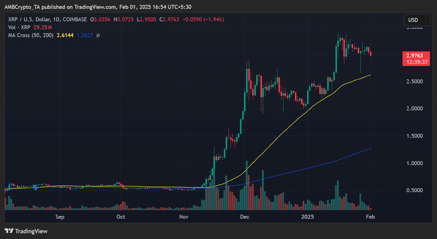 XRP was trading at $2.97 at press time, reflecting a 1.94% intraday decline. However, its long-term trend looked intact, with XRP significantly up from its 2024 lows.