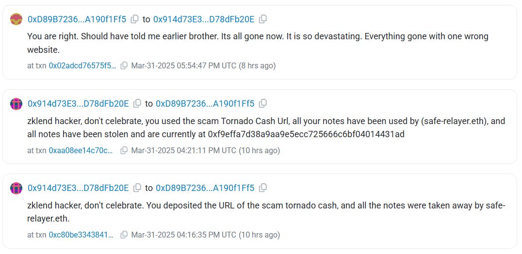 In a message sent to zkLend through Etherscan on March 31, the hacker claimed to have lost 2,930 Ether (ETH) from the stolen funds to a phishing website posing as a front-end for Tornado Cash.